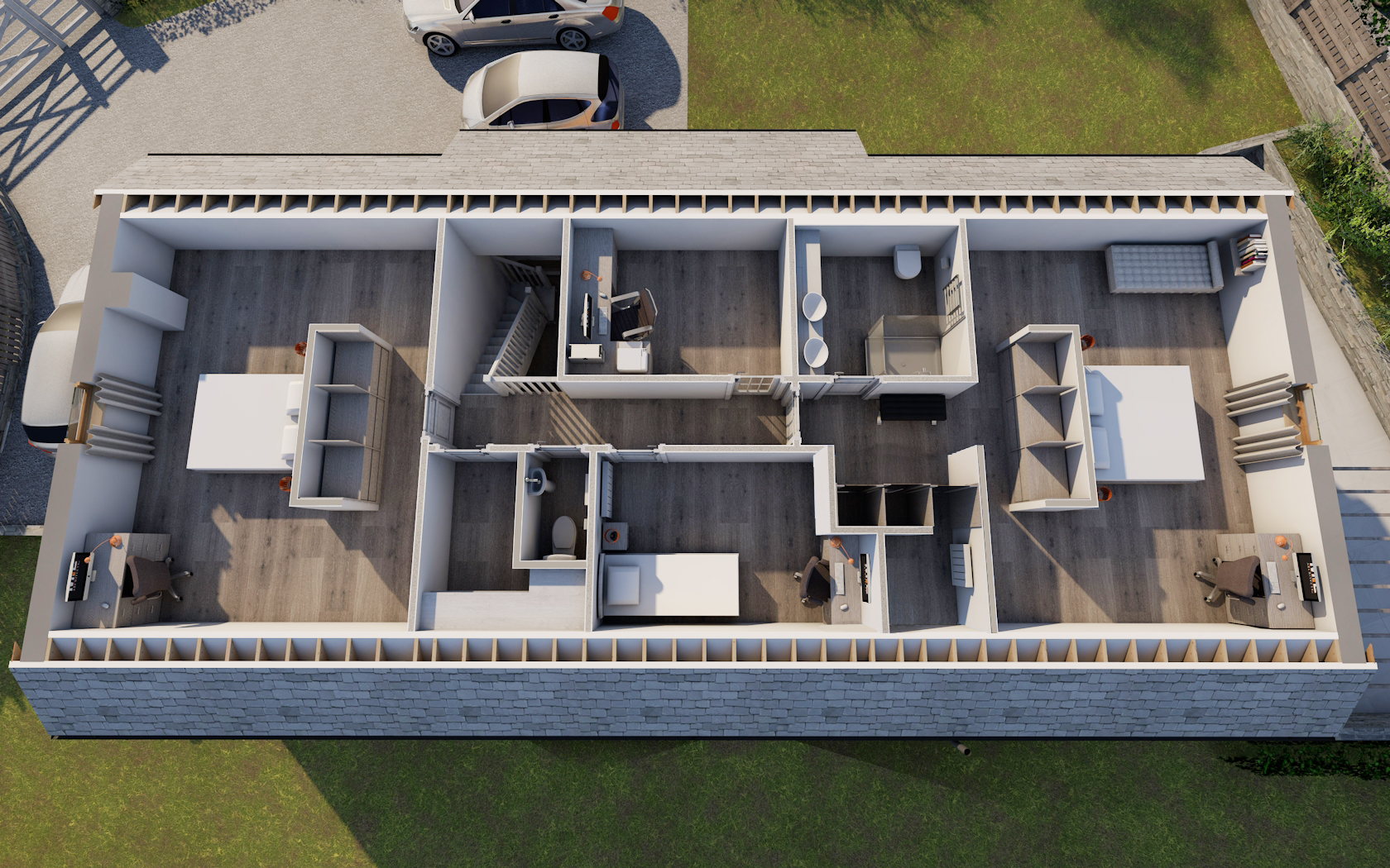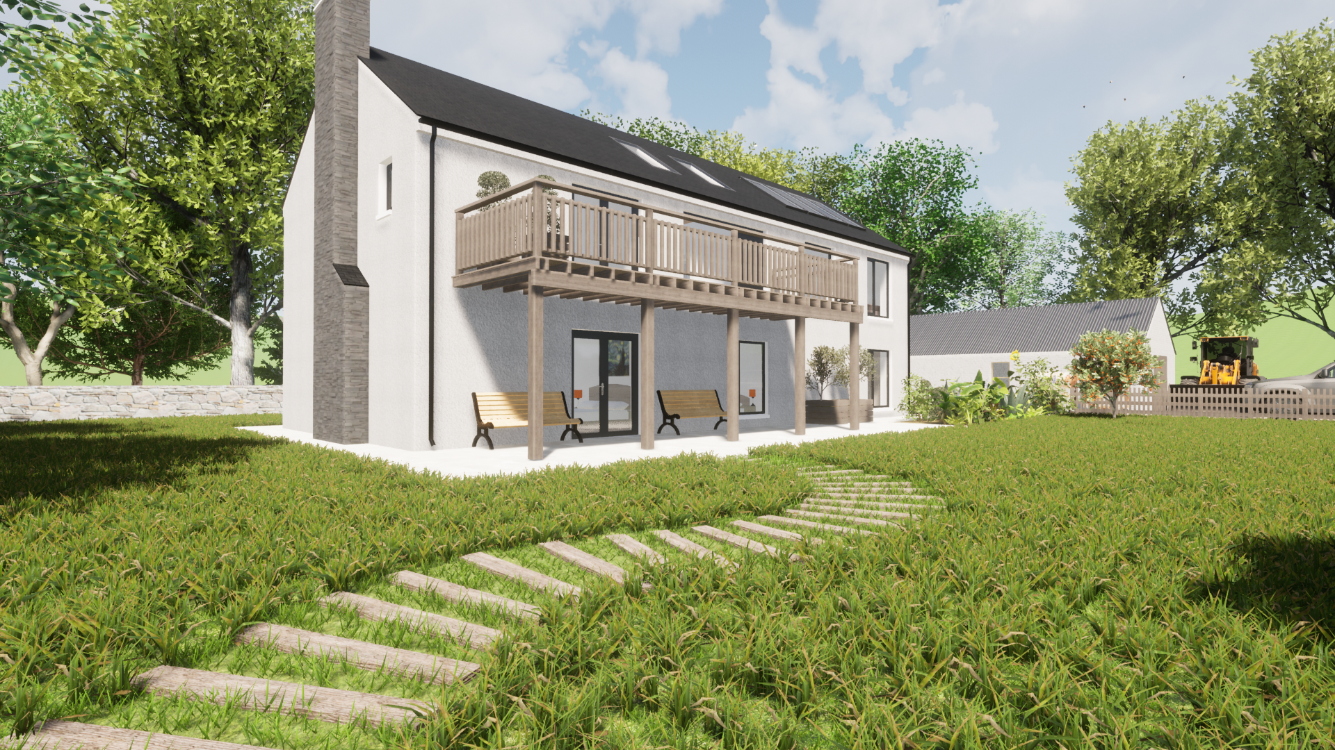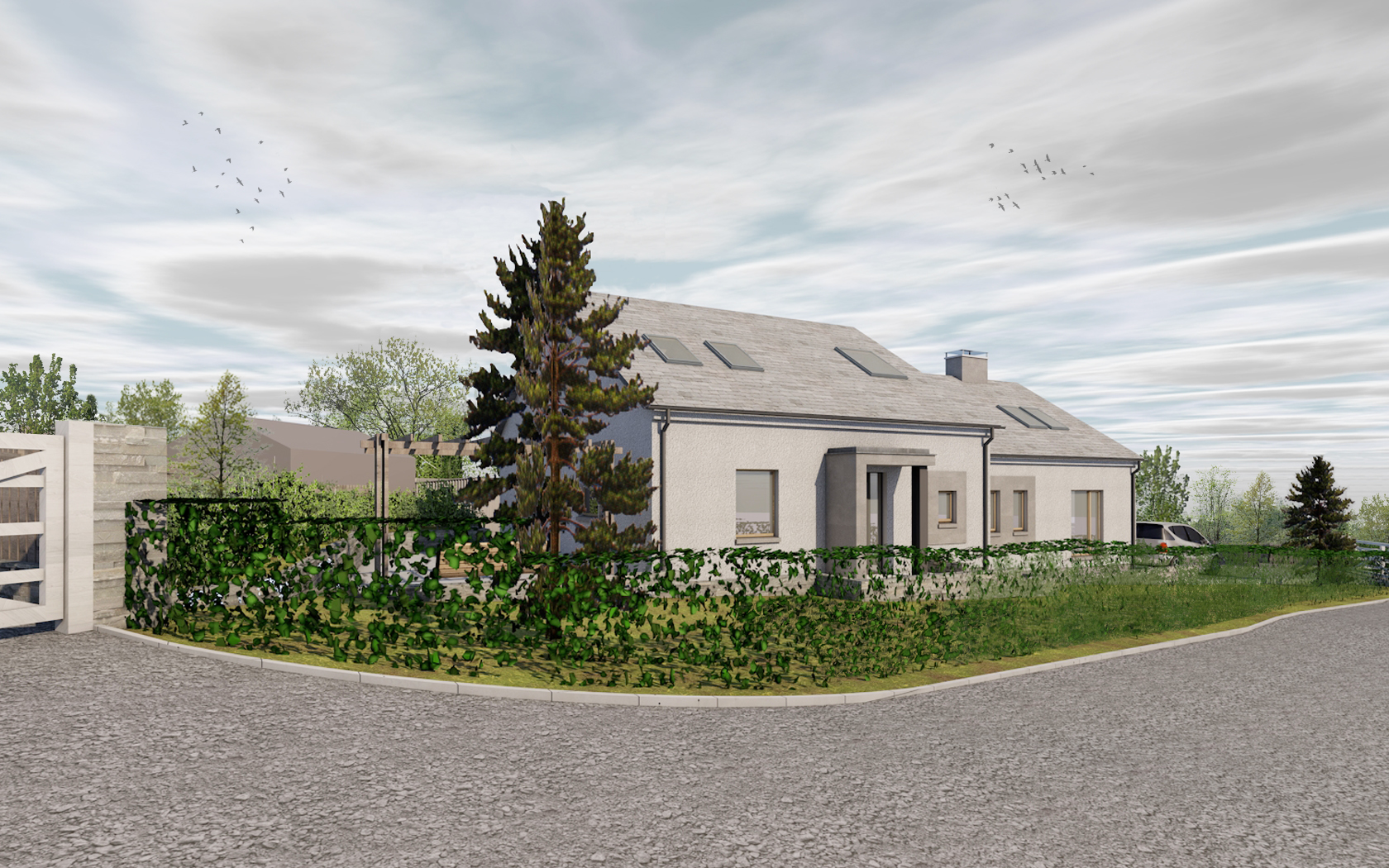 This proposal explores the possibility of building a new house within the grounds of an existing farmyard. An important feature of the house is the master bedroom at ground floor level which has been designed such that in future years, it can be easily adapted into a ‘granny flat’ with self contained kitchen and separate entrance via the double patio doors.