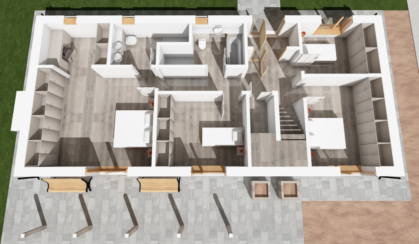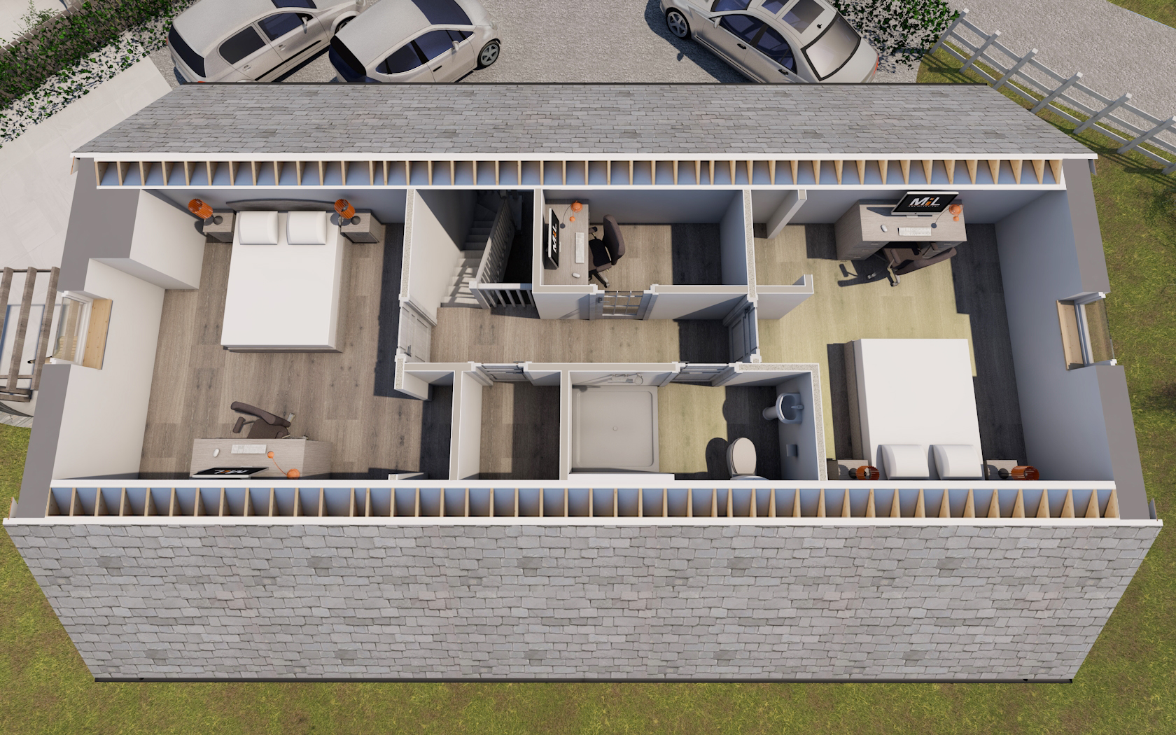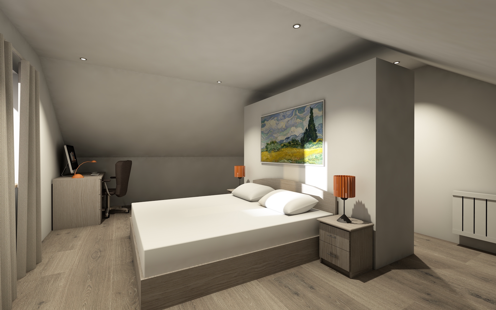 Existing three bed bungalow in Northern Ireland where the client requested a loft conversion. This was approved in principle at planning stage, therefore the skylights and first floor gable windows had already been installed. The brief was to maximise the use of the attic space with the aim of creating two additional bedrooms. Through careful planning, MiL Architects have managed to incorporate two bedrooms, a study and a second family bathroom, as well as increase the storage capacity to cope with the additional number of inhabitants.