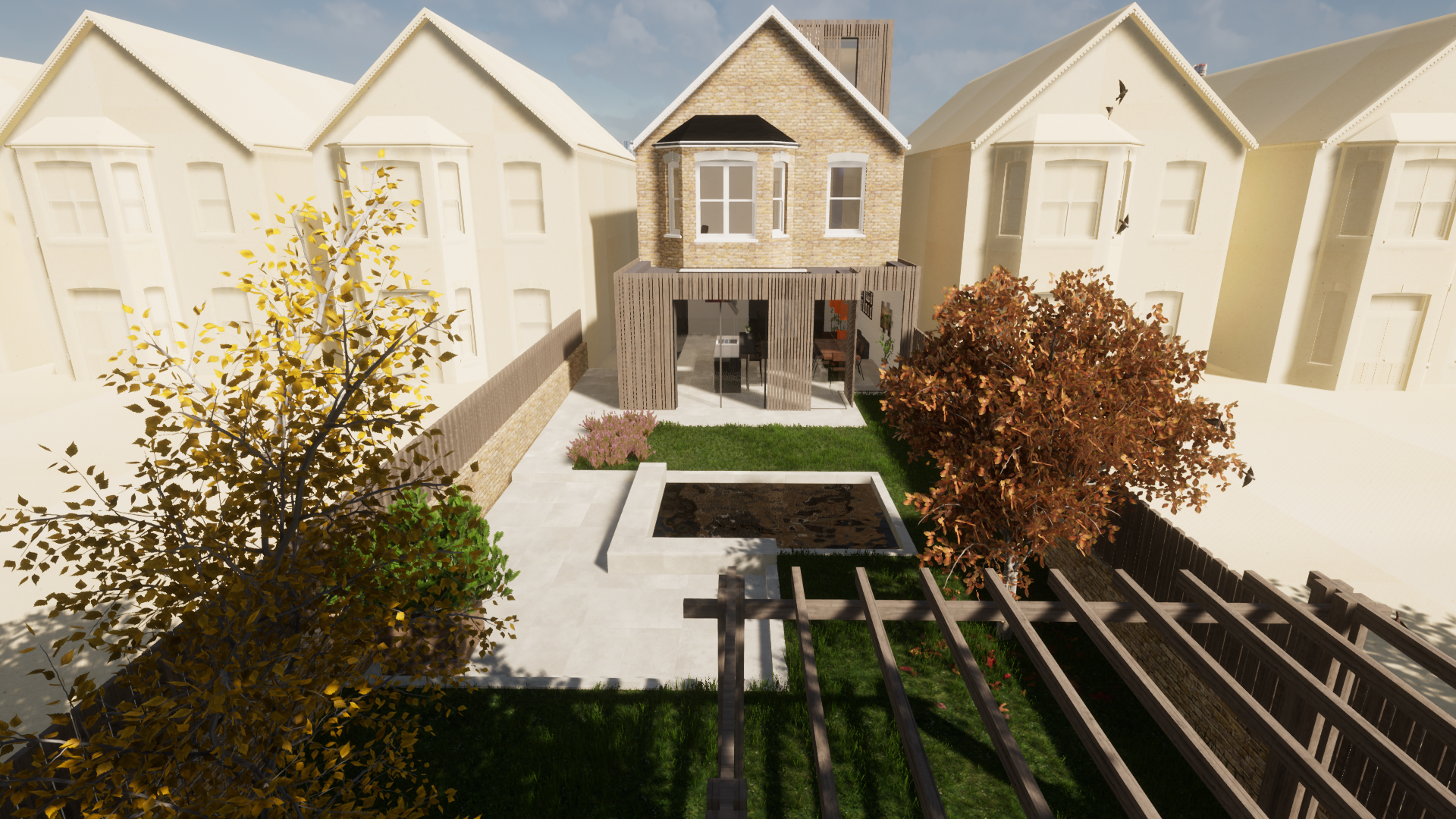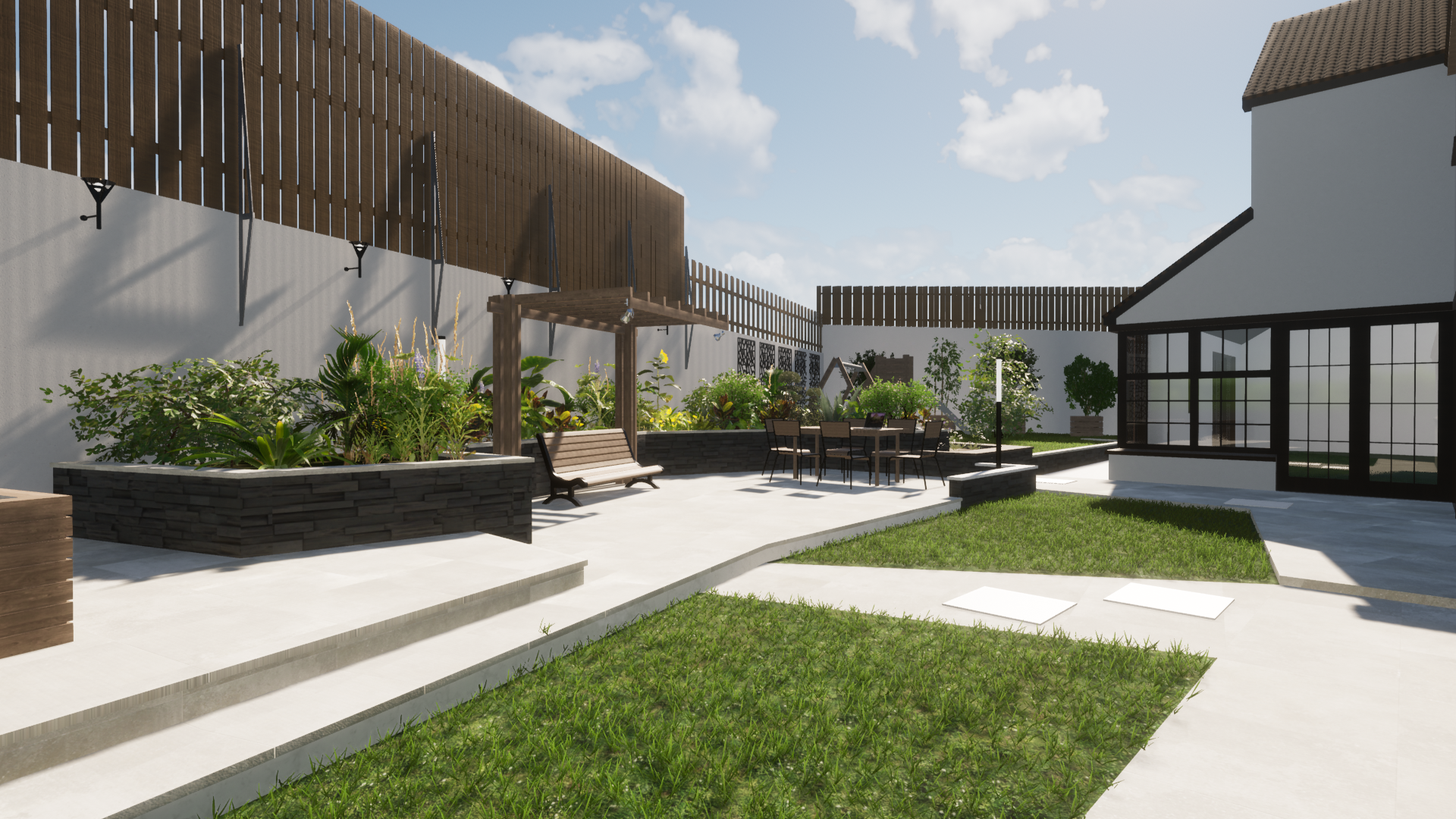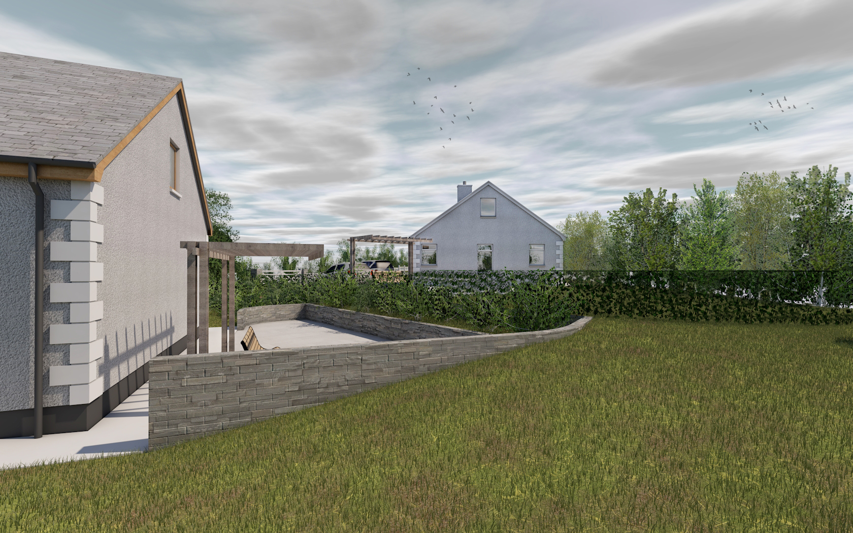 We were approached by the clients to propose a landscaping design for their rear garden – an irregular shaped space surrounded by high retaining structures on two sides. They wanted to create a hierarchy of spaces, and to provide more appropriate play areas for their young children. The concept was based on creating subtle level changes which would be used to enclose separate areas of the garden, providing a centralised terrace area which appears to be sunk into the landscape, as well as a more intimately proportioned courtyard which could someday be used for a sauna and / or pool for the children. The geometry was inspired by the irregular shape of the garden, and indeed the house itself, which has undergone several renovations and extensions over the years. A combination of 2D and 3D drawings were prepared, as well as a fly-through video which really helped to visualise the proposals