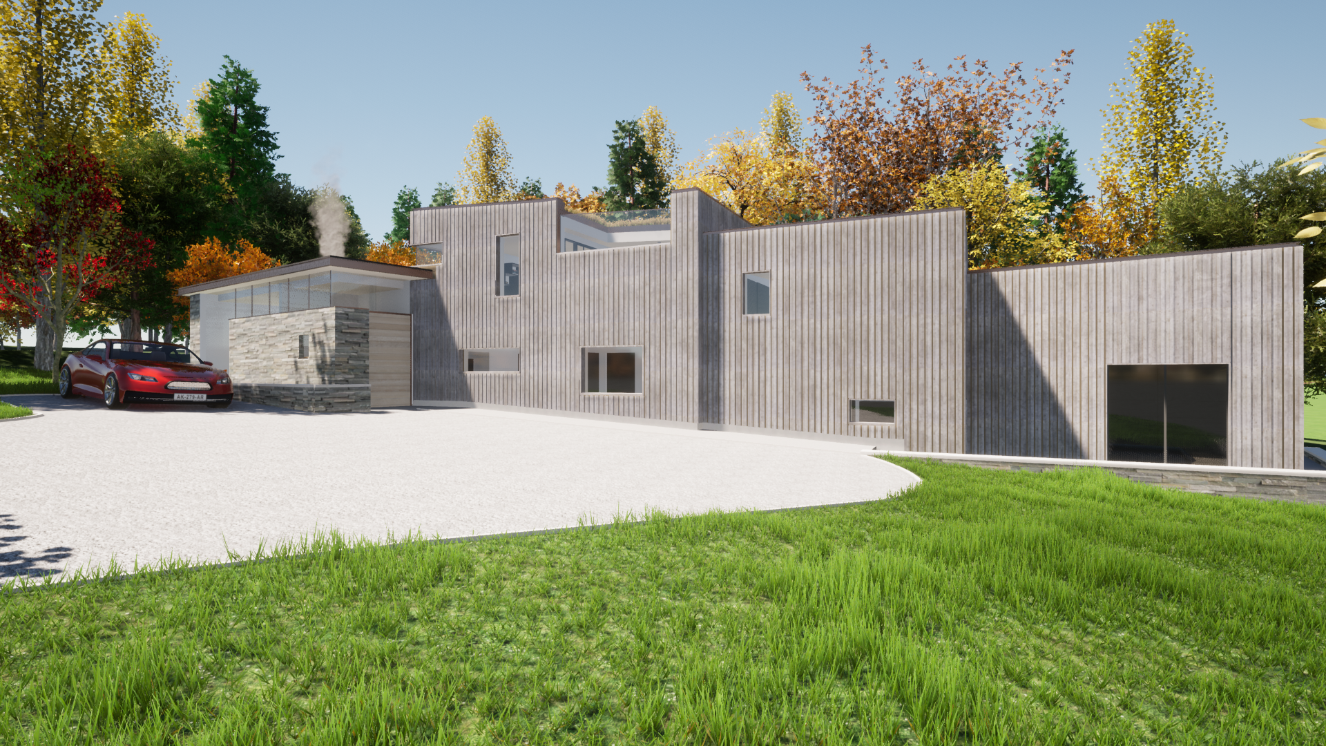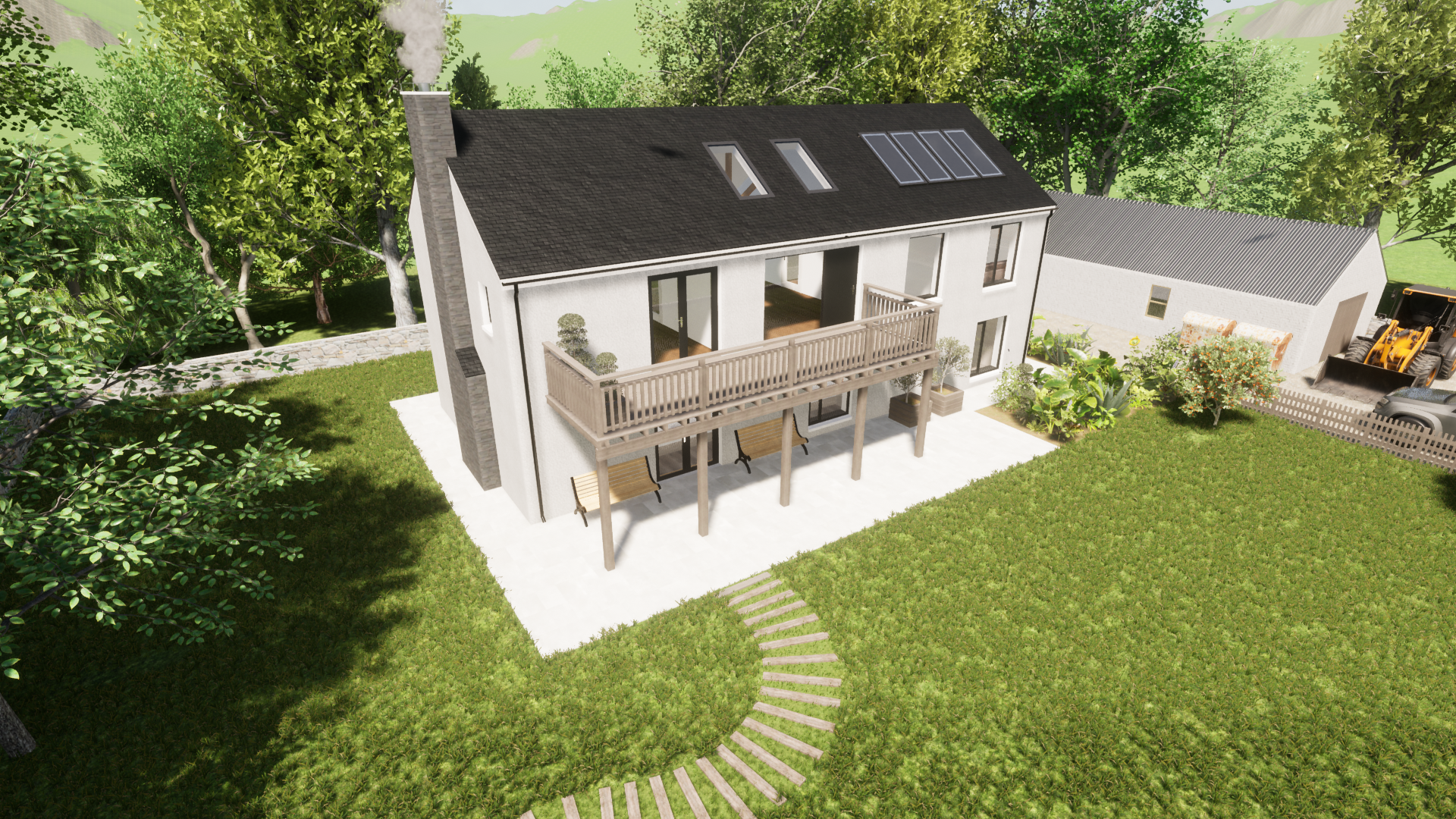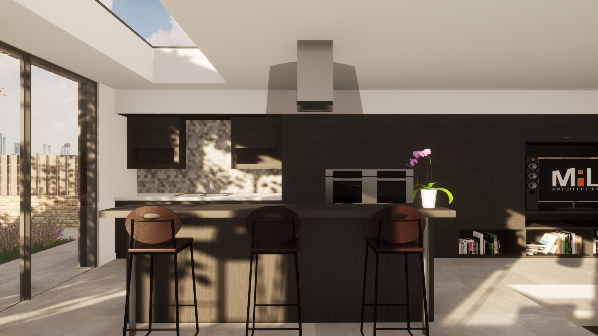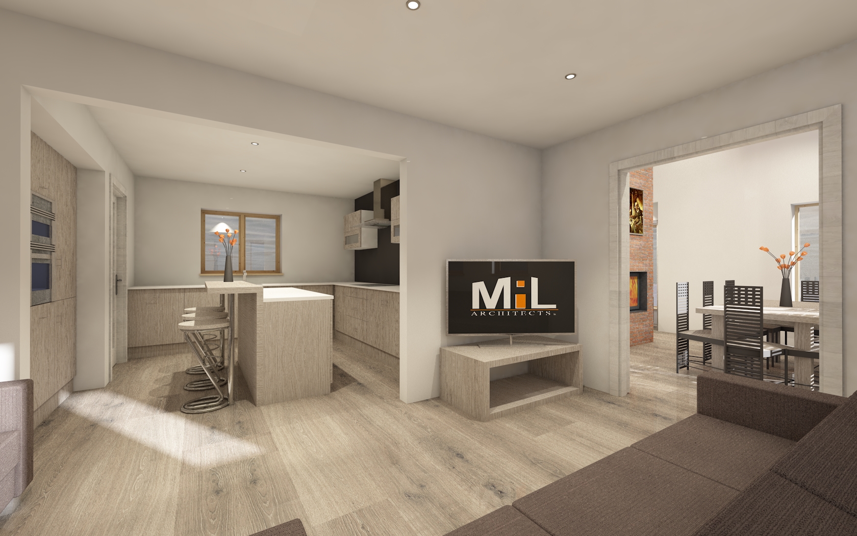 Whether you have a green-field/brown-field site, or even an old barn – there are many possibilities open to you regarding development. In this example, an old stone barn is renovated and connected to a new build bungalow via a frameless glass link. MiL are able to produce seasonal specific renders of your final design – Christmas is a favourite with many people.