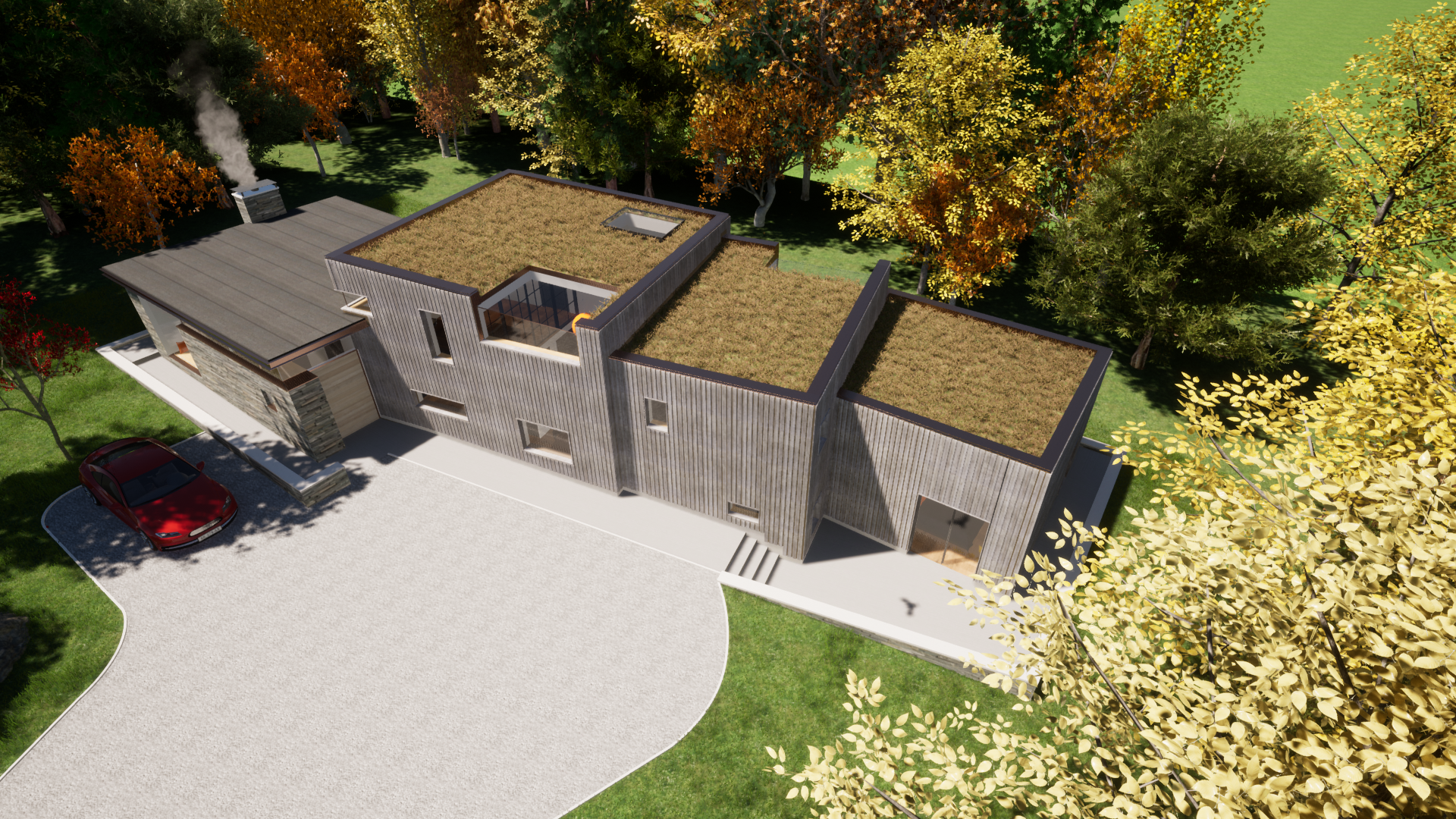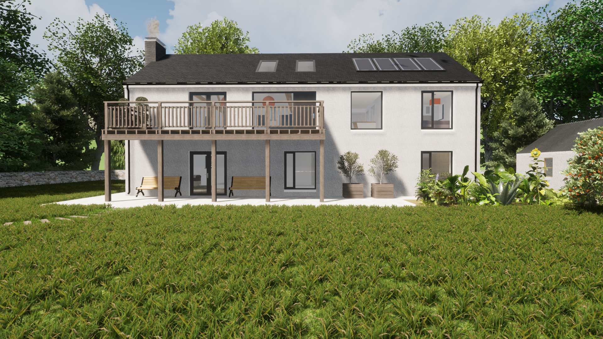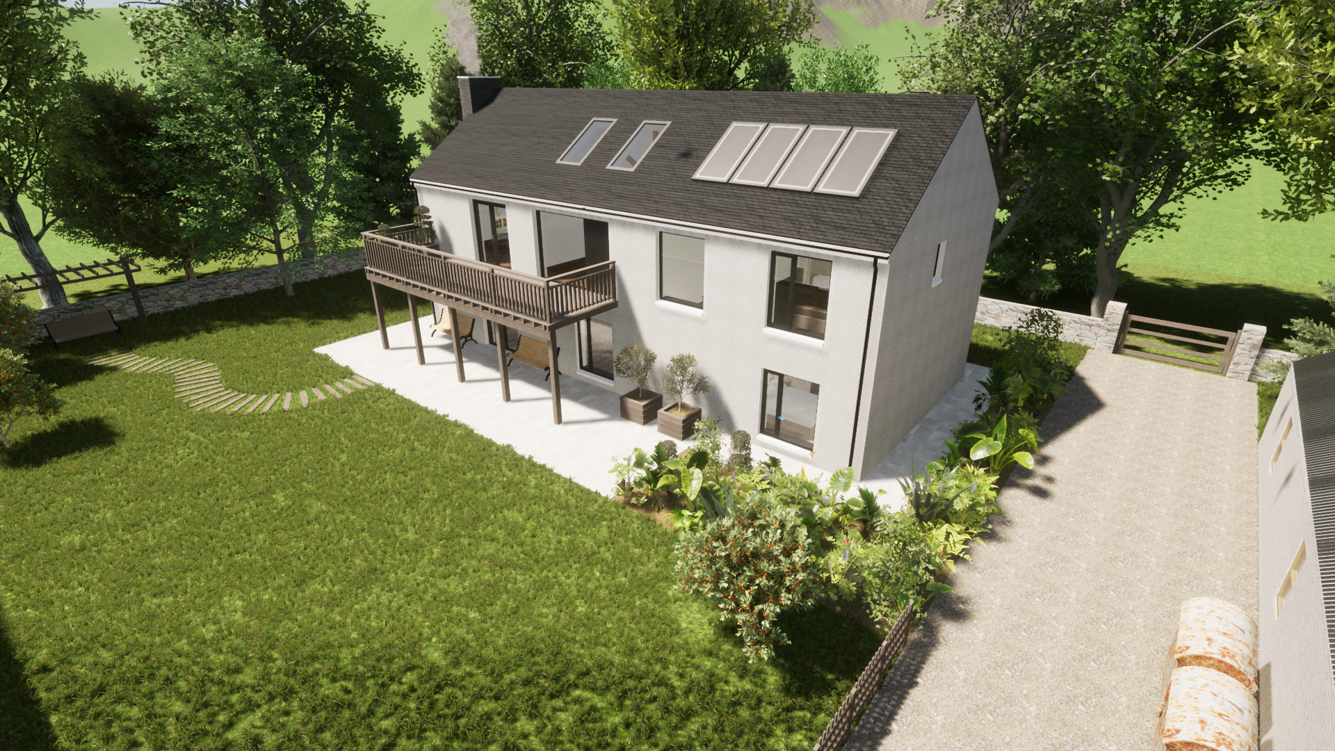 Whether you have a green-field/brown-field site, or even an old barn – there are many possibilities open to you regarding development. In this example, an old stone barn is renovated and connected to a new build bungalow via a frameless glass link. MiL are able to produce seasonal specific renders of your final design – Christmas is a favourite with many people.