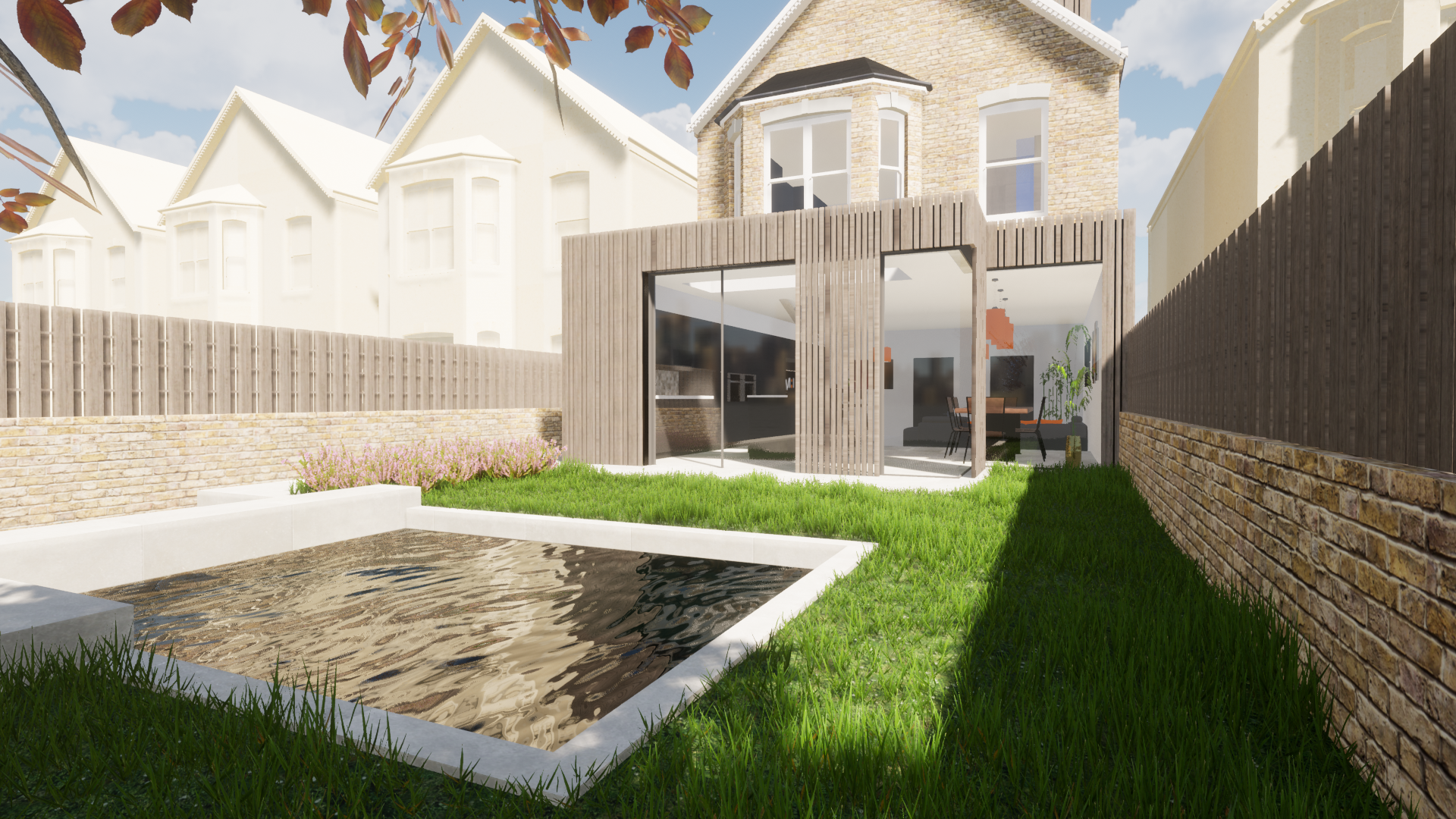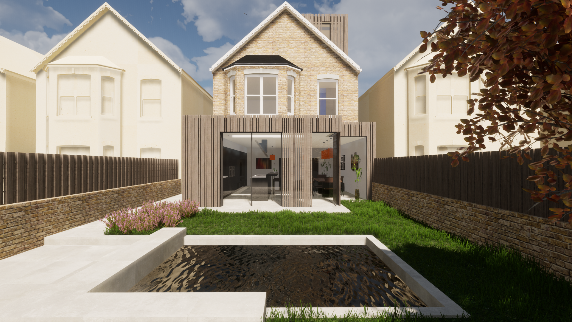 This proposal involves a new roof dormer, accommodating an additional bedroom with en-suite facilities, as well as general modernisation of this semi-detatched house. At ground floor level, the internal layout is modified to rationalise the plan, expand the living spaces and improve the circulation. Extending sideways, adjacent to the existing outrigger, allows integration of a new open plan kitchen and dining area, with full height sliding patio doors flooding the space with light and creating that ever envied connection to the garden.